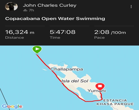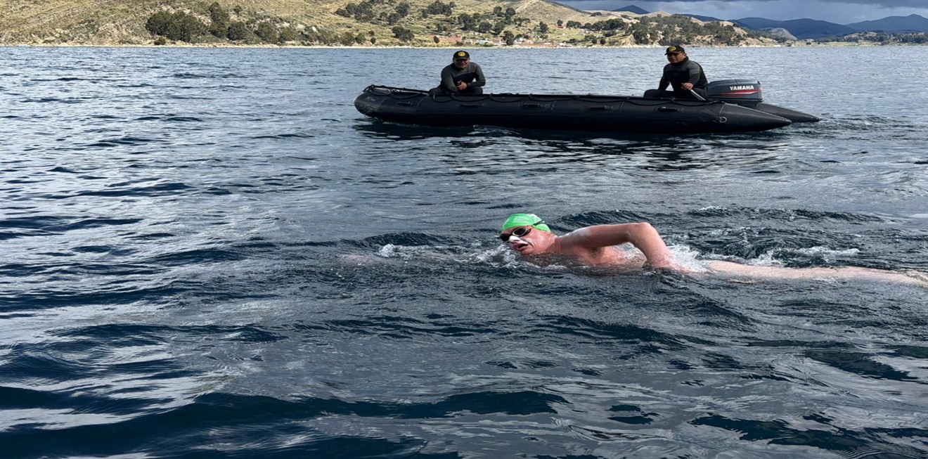 Copacabana, Bolivia.– Con el objetivo de promover la preservación del medio ambiente y la protección del lago Titicaca, el nadador irlandés John Curley realizó con éxito un cruce a nado continuo de 16 kilómetros, desde la Isla Koa, en la Isla del Sol, hasta la Isla Yumani, en Copacabana (Bolivia), completando el recorrido en un tiempo de 5 horas y 43 minutos.